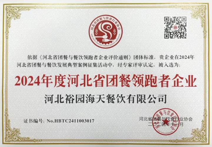 11月26日,由河北省团餐与饮食行业协会主办的第六届河北省团餐与餐饮产业发展大会顺利举办,河北旅投世纪物业集团海天餐饮公司荣获“2024年度河北省团餐领跑者企业”奖项。