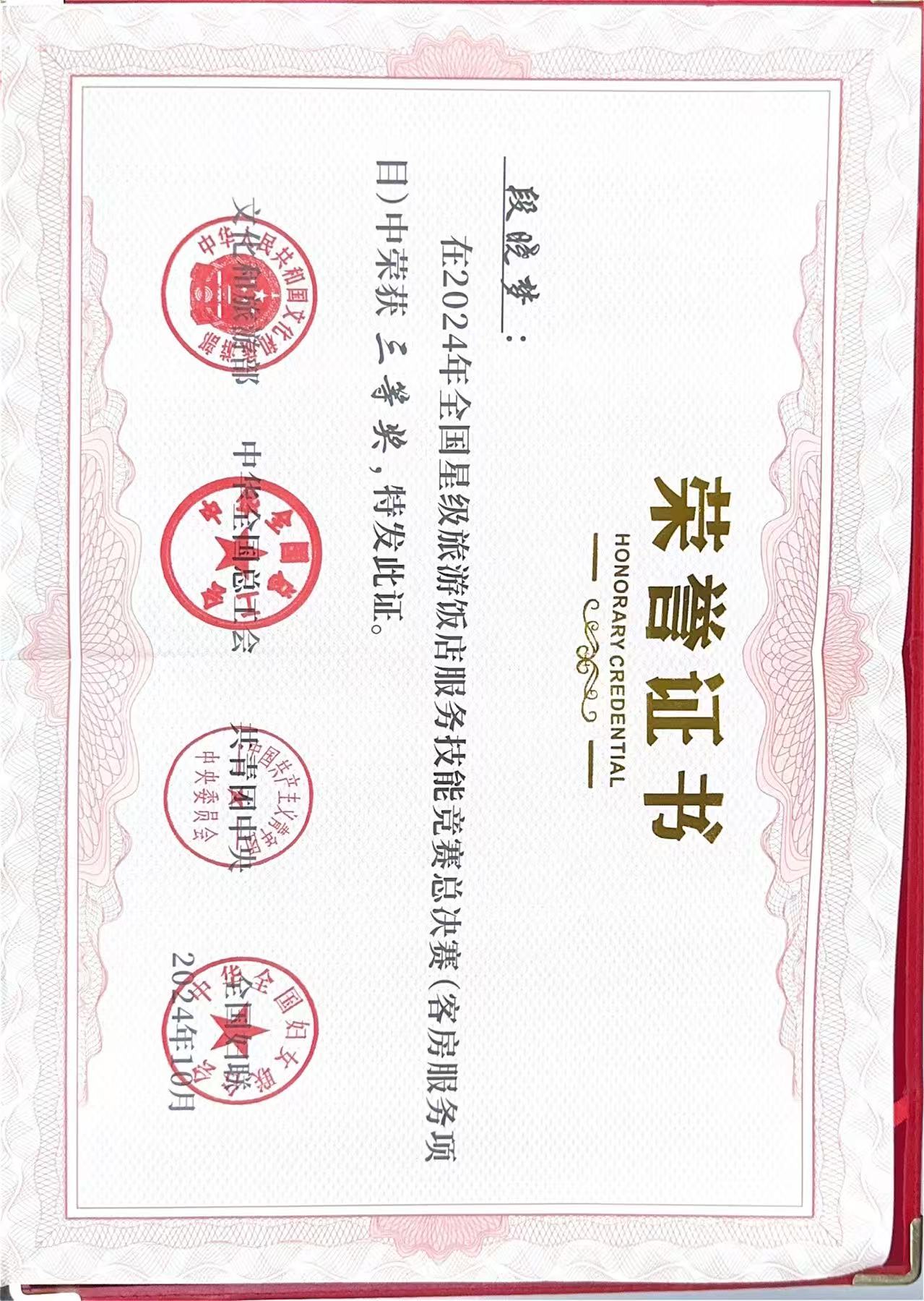 段晓梦荣获2024年全国星级旅游饭店服务技能竞赛总决赛三等奖
